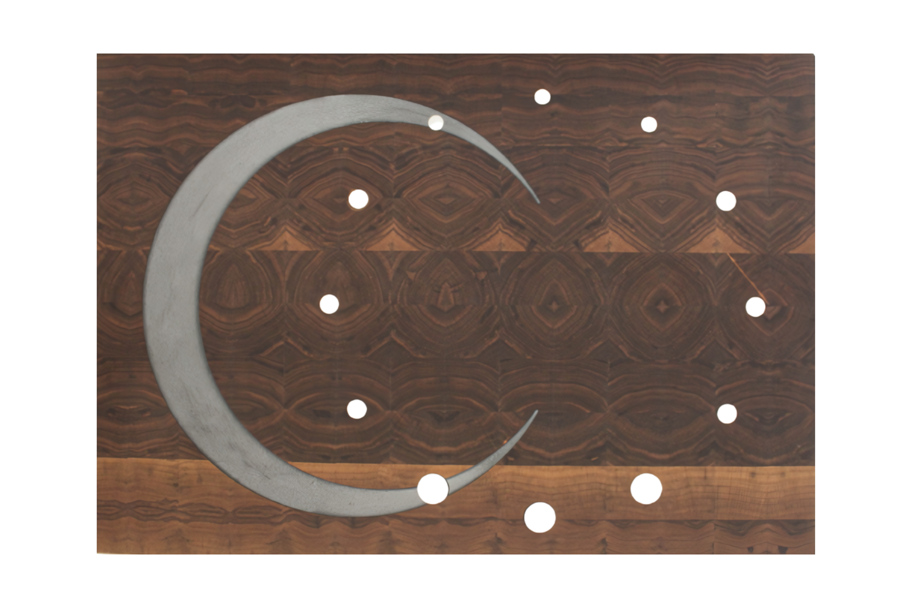 18” x 25” X 2” walnut "phases" board. A demilune of aluminum resin intersects a circle of inlaid aluminum disks, denoting the phases of the moon.
