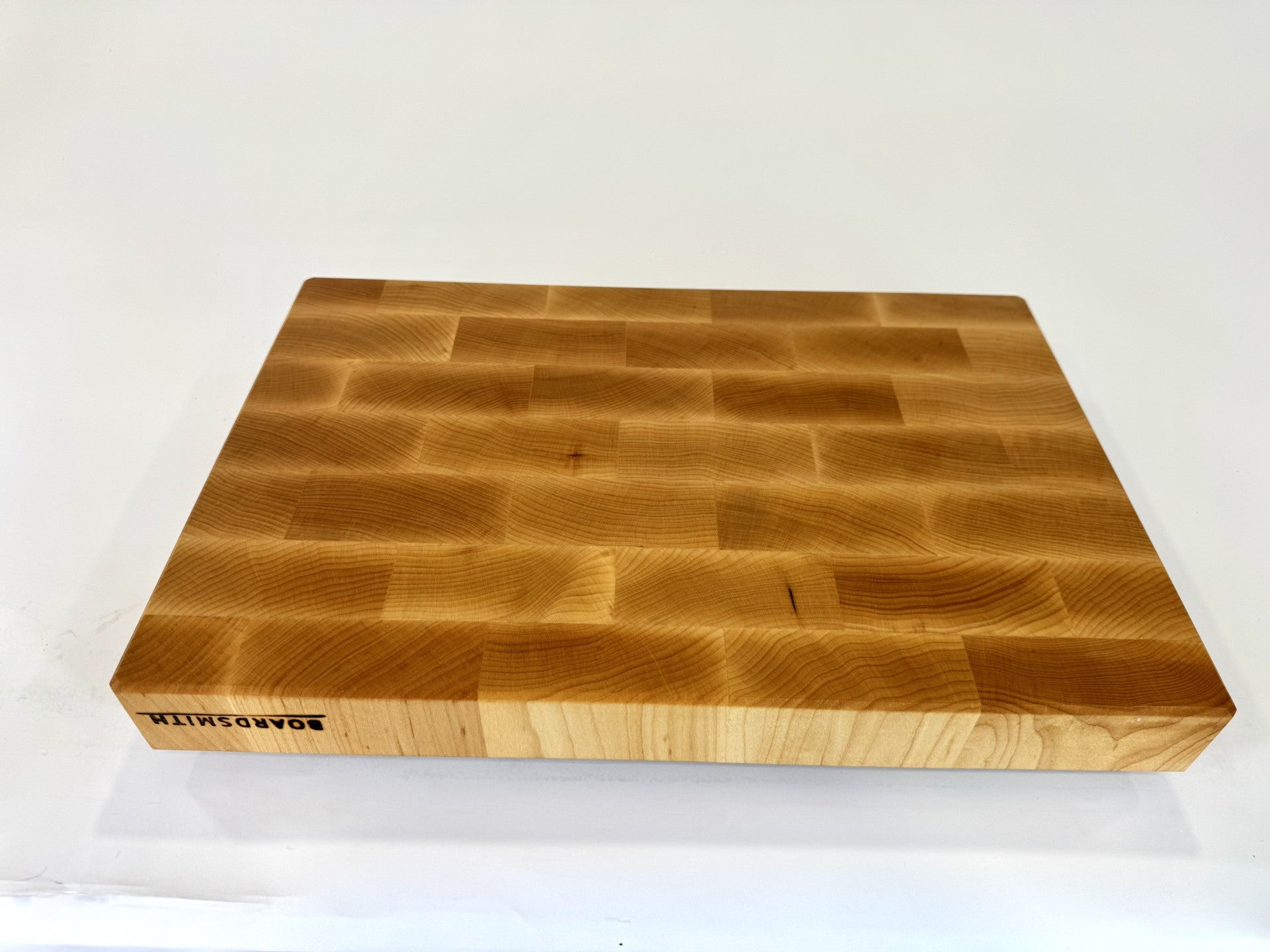 Frankenboard: When making butcher block, the first step is to glue up a large panel. We then cross-cut strips from that panel, turning them on end in sequence and gluing those together to form the final butcher block. We often have extra strips from any given panel. When we have a butcher block formed from strips from more than a single panel, that’s a “Frankenboard.” Nothing wrong with it, it’s just that the look of the grain pattern from one row to the next doesn’t necessarily flow seamlessly.