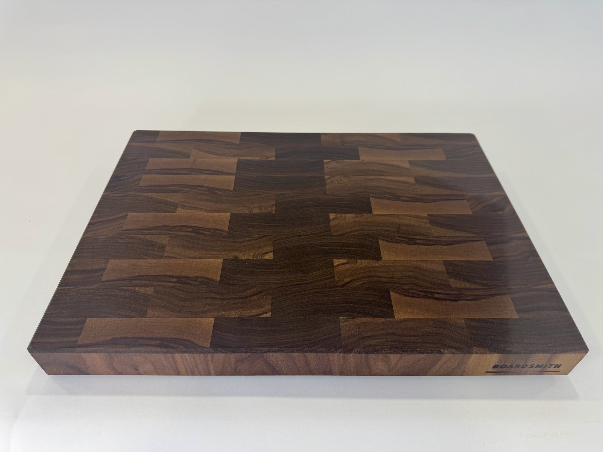 Frankenboard: When making butcher block, the first step is to glue up a large panel. We then cross-cut strips from that panel, turning them on end in sequence and gluing those together to form the final butcher block. We often have extra strips from any given panel. When we have a butcher block formed from strips from more than a single panel, that’s a “Frankenboard.” Nothing wrong with it, it’s just that the look of the grain pattern from one row to the next doesn’t necessarily flow seamlessly.