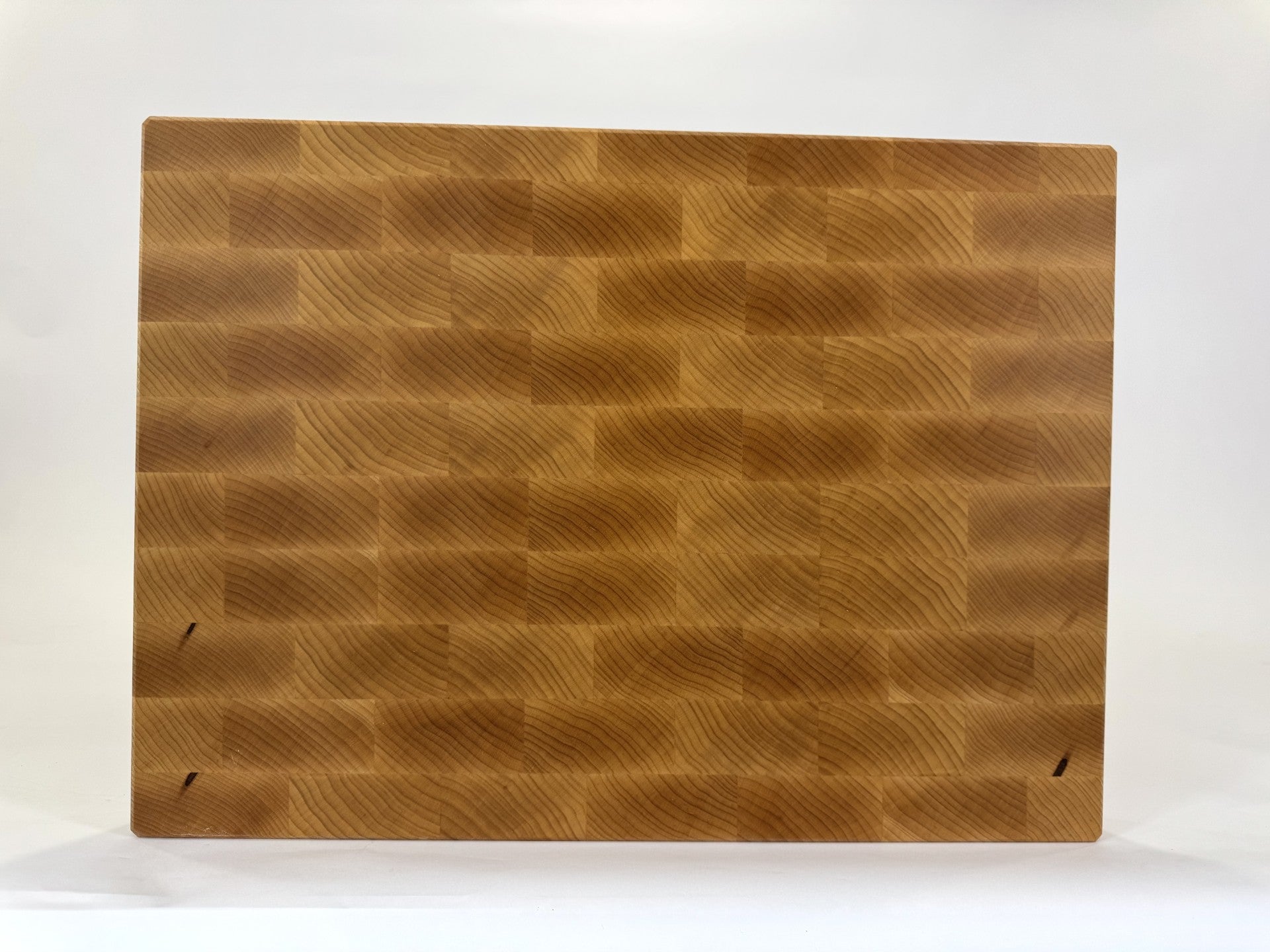 Frankenboard: When making butcher block, the first step is to glue up a large panel. We then cross-cut strips from that panel, turning them on end in sequence and gluing those together to form the final butcher block. We often have extra strips from any given panel. When we have a butcher block formed from strips from more than a single panel, that’s a “Frankenboard.” Nothing wrong with it, it’s just that the look of the grain pattern from one row to the next doesn’t necessarily flow seamlessly.