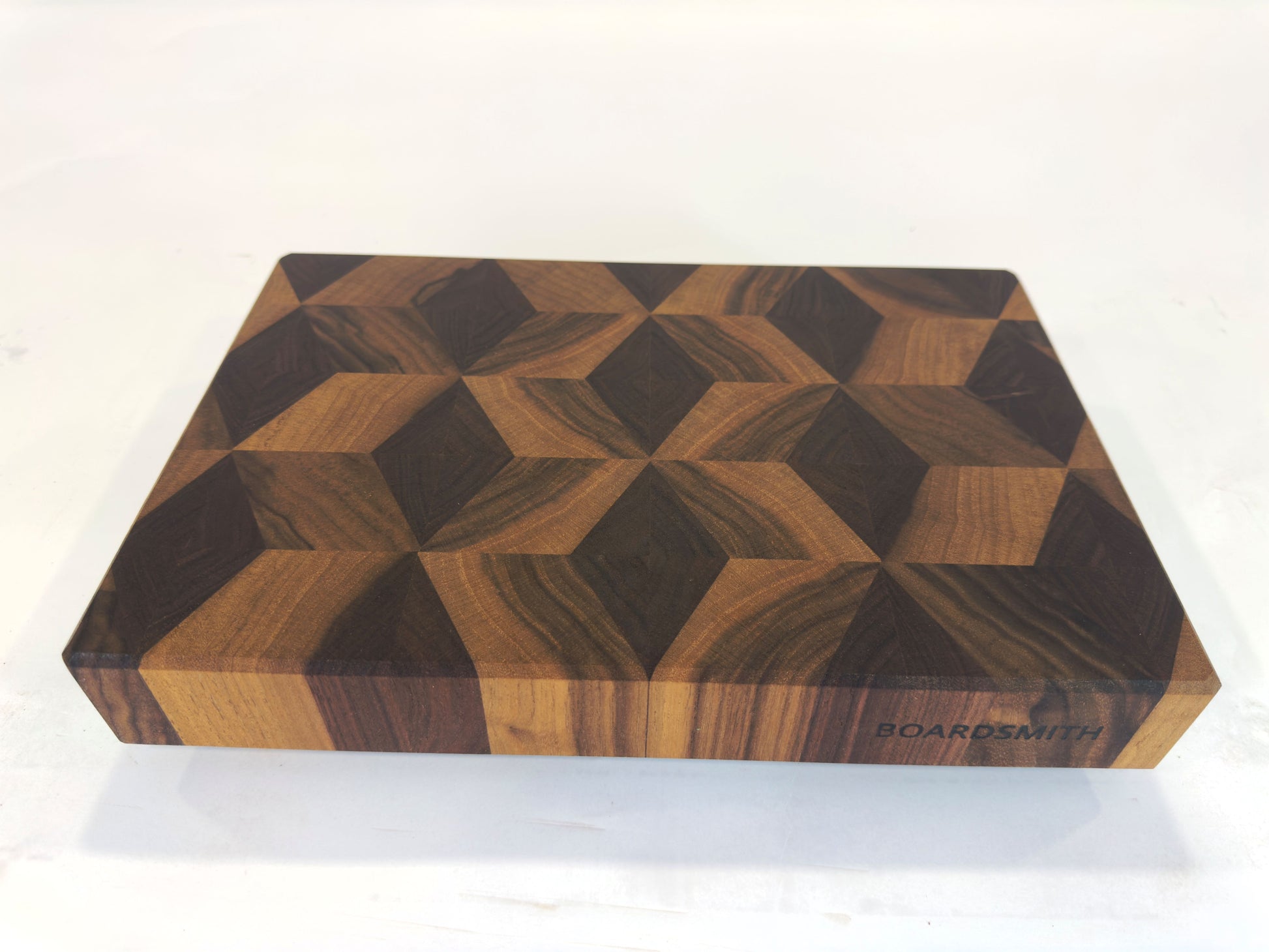 This beautiful board is what we consider a "one-off". A customer asked us to create the look of a diamond or 3D grain pattern in each block. While making that, we made a small one from the left over strips.