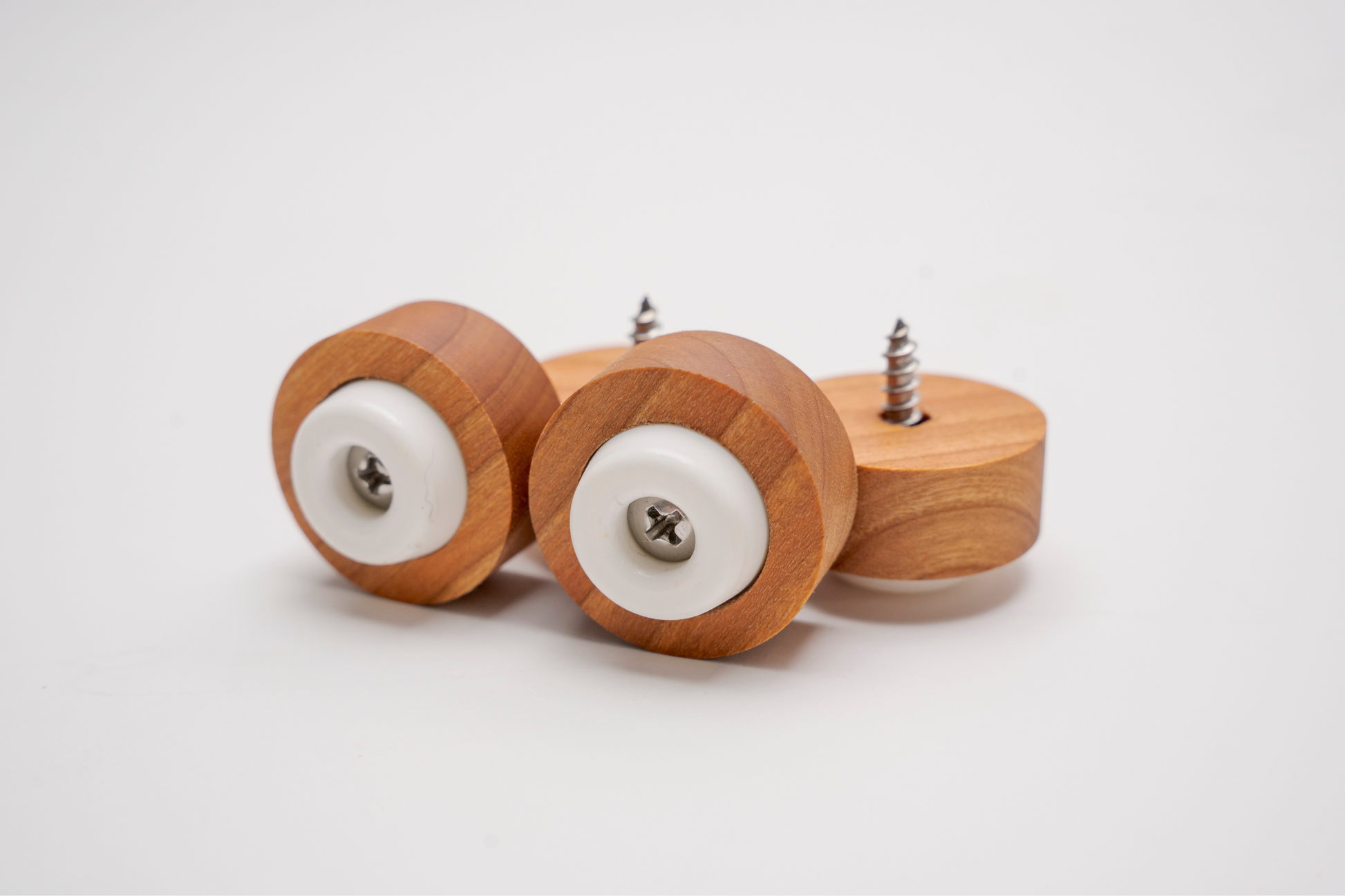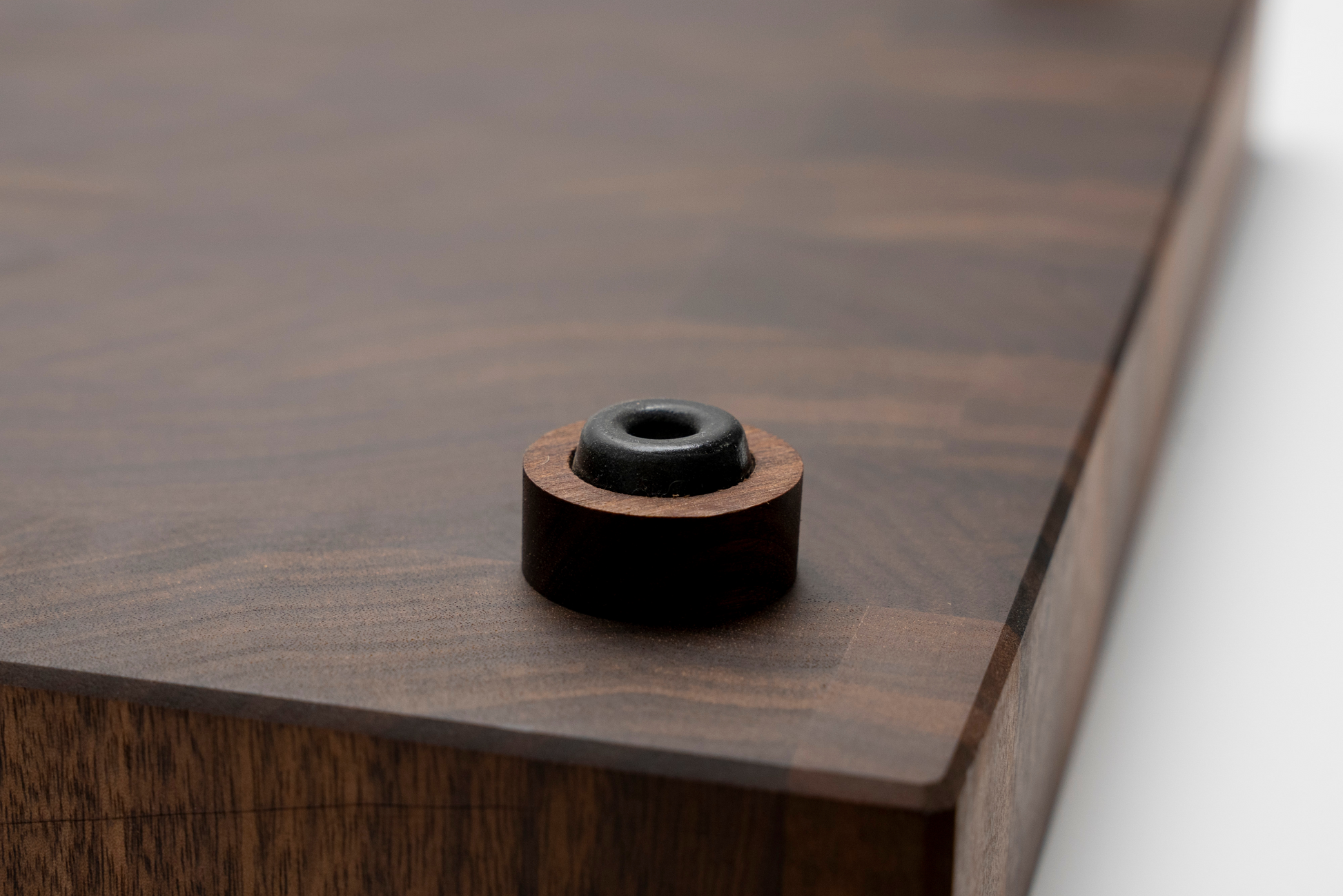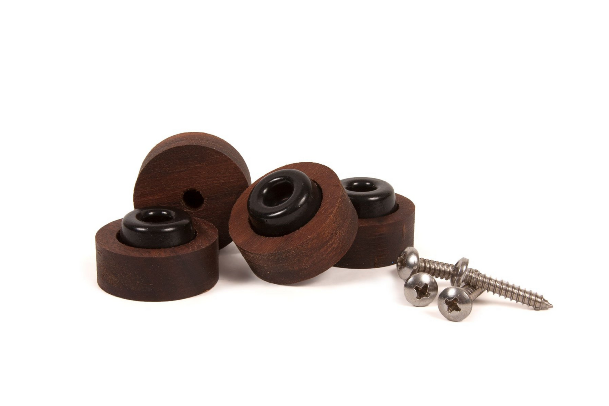 Boardsmith non-slip cutting board feet are comprised of two parts: an outer wooden escutcheon that we make by hand in our shop, and an inner polyurethane foot or bumper that nests inside the escutcheon. The wood is pre-treated with pure mineral oil prior to shipping. The butcher block feet set also includes four, #10, pan-head stainless steel screws. Unlike normal coated screws, stainless steel screws will not rust with prolonged exposure to moisture.