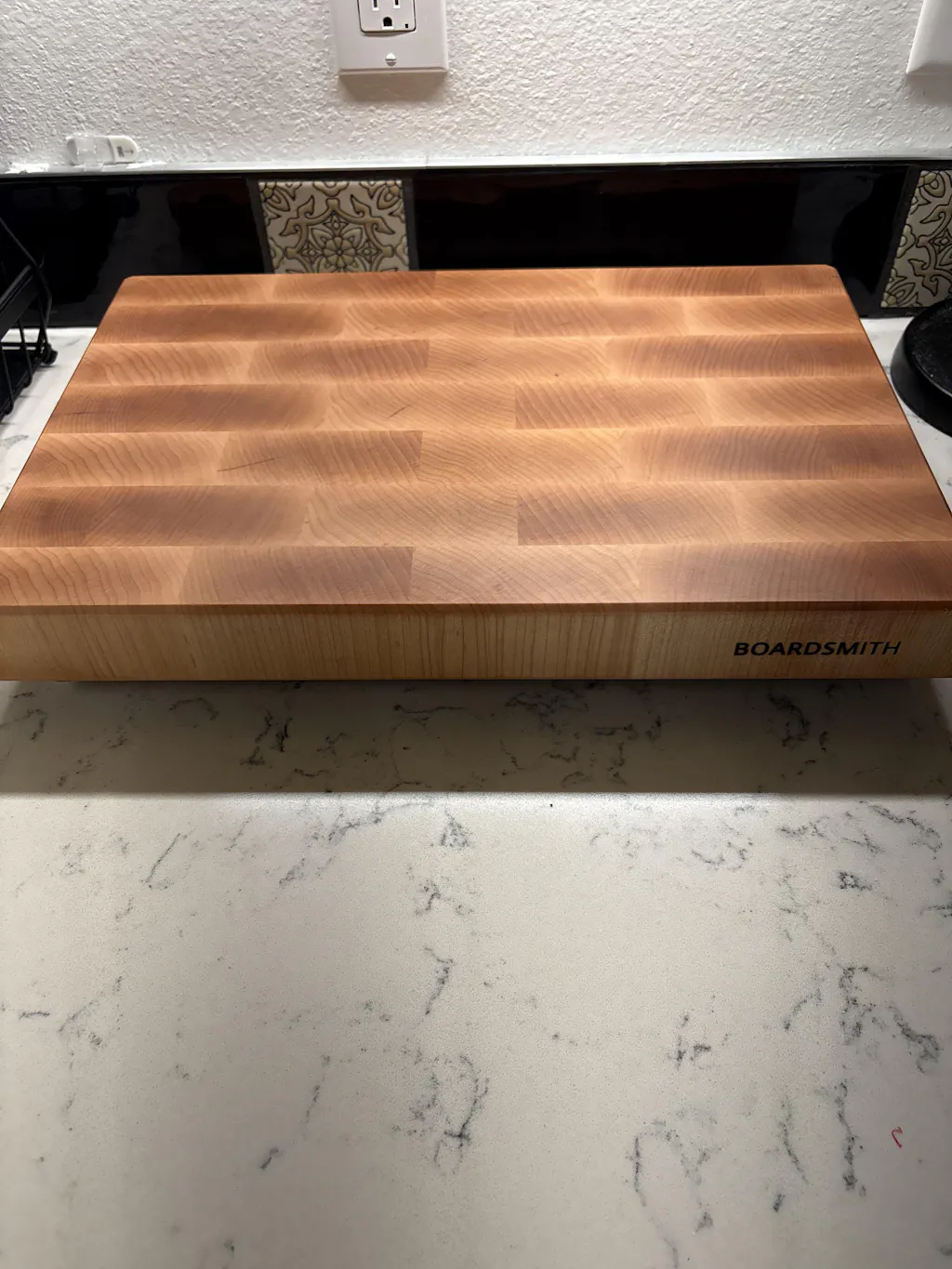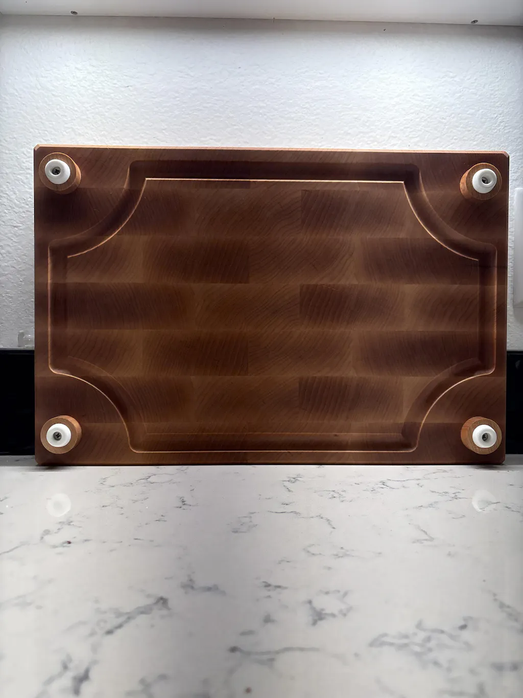 Our standard maple end grain cutting boards are 2" thick. Cutting board feet add an additional 3/4" and are highly recommended unless the user is under 5'3" (160cm) in height.