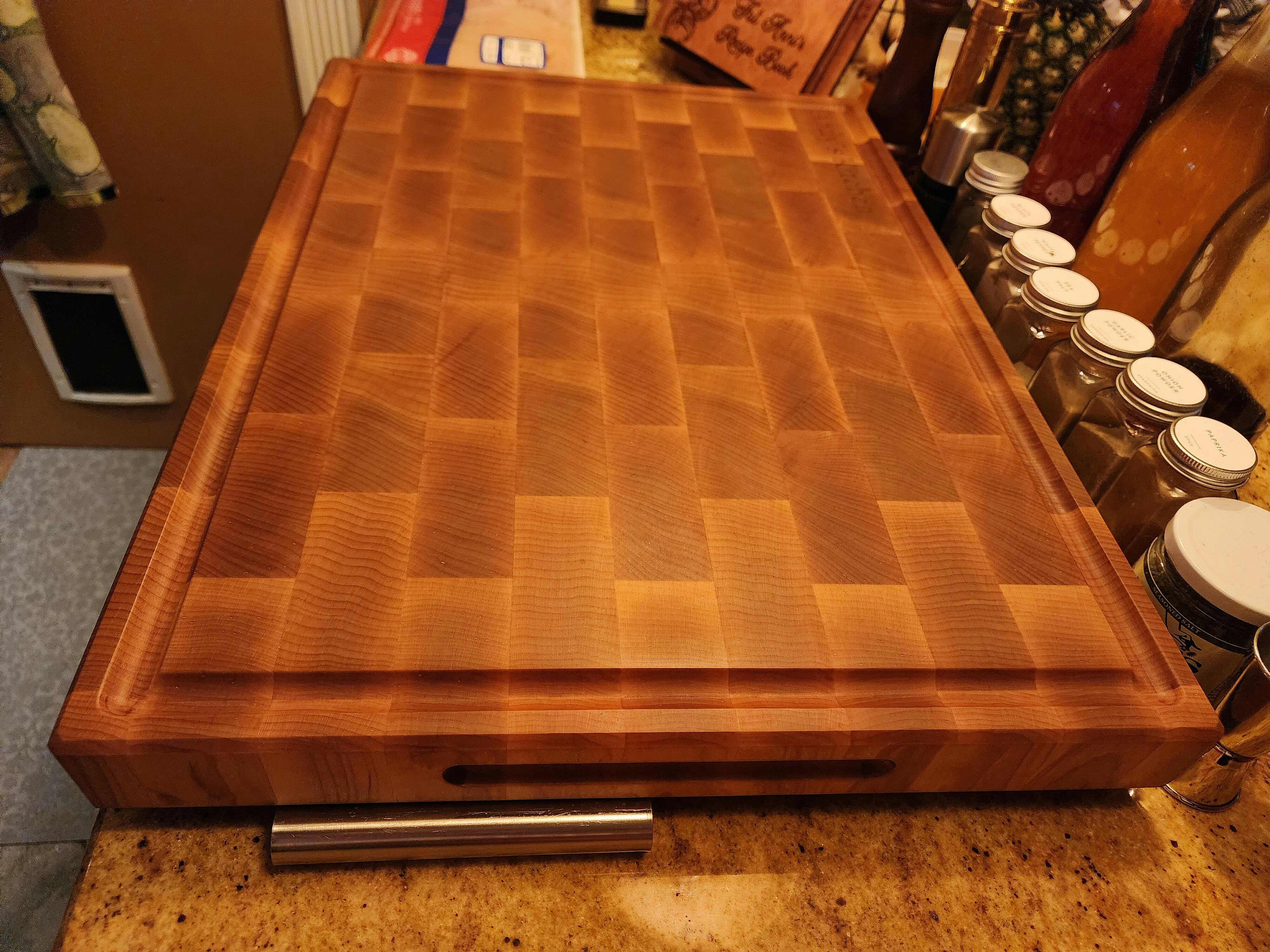 - Choose an area where you are less likely to chop, and consider selecting a larger board for a greater chopping area. Alternatively, you can request that we not install feet so that your board can be flipped for chopping on the other side.